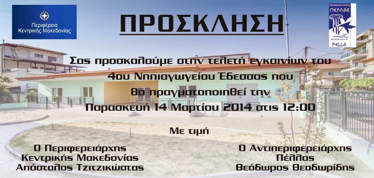 Την Παρασκευή, 14 Μαρτίου 2014 και ώρα 12.00 το μεσημέρι θα πραγματοποιηθούν τα εγκαίνια του 4ου Ολοήμερου Νηπιαγωγείου Έδεσσας από τον Περιφερειάρχη Κεντρικής Μακεδονίας Απόστολο Τζιτζικώστα και τον Αντιπεριφερειάρχη Πέλλας Θεόδωρο Θεοδωρίδη.