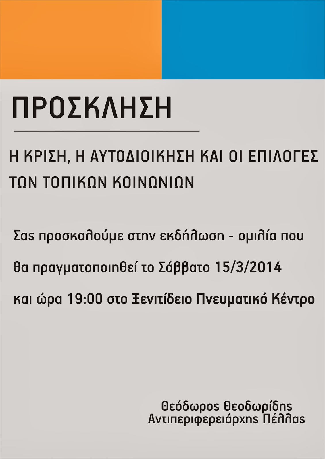 Σήμερα Σάββατο, 15 Μαρτίου και ώρα 7 το απόγευμα, στο Ξενιτίδειο Πνευματικό Κέντρο, στην Αριδαία, θα πραγματοποιηθεί ενημερωτική εκδήλωση με κύριο ομιλητή τον Αντιπεριφερειάρχη Πέλλας και Αναπτυξιακού Προγραμματισμού – Σχεδιασμού της Π.Κ.Μ. κ. Θεόδωρο Θεοδωρίδη ο οποίος θα παρουσιάσει το θέμα «Η Κρίση, η Αυτοδιοίκηση και οι Επιλογές των Τοπικών Κοινωνιών».